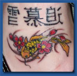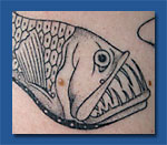 I just got this tattoo in July 2004, after trying for 7 years to get a design. I chose a viperfish for a combination of reasons. As an ichthyologist, I find the ways these fish have evolved in their environment fascinating. This fish also reminds me of the greatest teacher I ever had at any level- Dr. Robert Johnson. Dr. J, who studied mesopelagic fishes off the coast of Somalia, taught my ichthyology and deep sea biology courses at the Grice Marine Lab. Dr. J passed on a few years back and he is missed. -Brad Wiley |