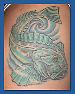 The reason I got a tattoo of a lingcod is because its my favorite fish for a number of reasons. The number one reason is that they are ravanous beasts that never seem to be full. I really dig going through their gut and seeing what they ate last. I once found a large octopus,a small skate and a still twitching juvenile shark in one. The second major reason is they taste great. Also I find the colors of a green one to be really cool and think its just all around a very handsome fish. -Abel Zutler |
